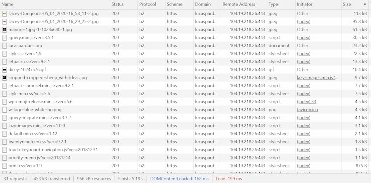 Note that because of lazy loading, scripts or images don’t appear to have a huge effect on some of the critical events in either case. But it sure doesn’t offend me to see that, due to Cloudflare’s speed features (see Background) DOMContentLoaded and Load times are under 200ms, with Lighthouse reporting a Performance of 96 based on First Contentful Paint 0.4s, Time to Interactive 0.4s, and Largest ContentfulPaint 0.5s. I lost points on Cumulative Layout Shift but I can fix that some other day.